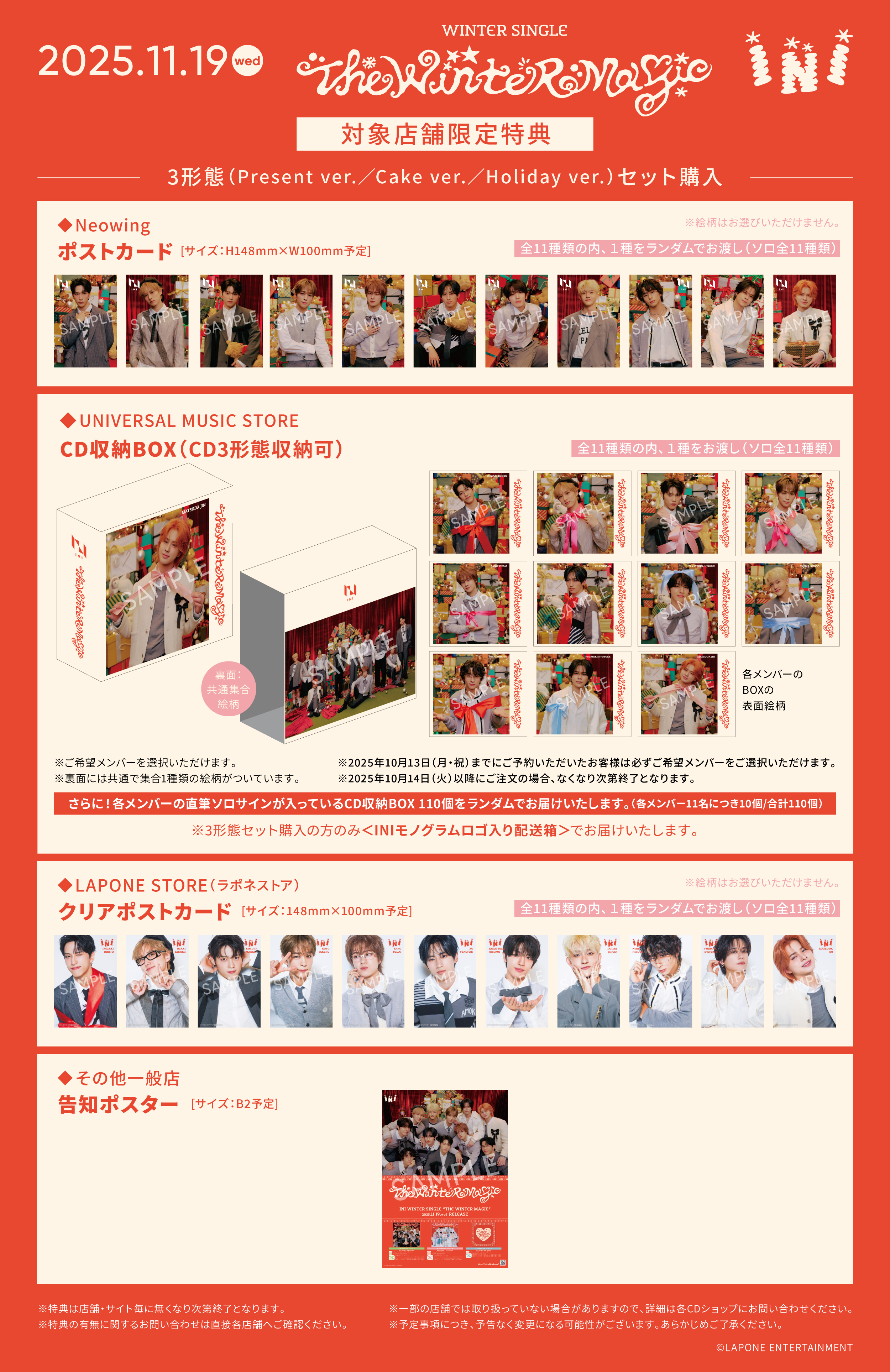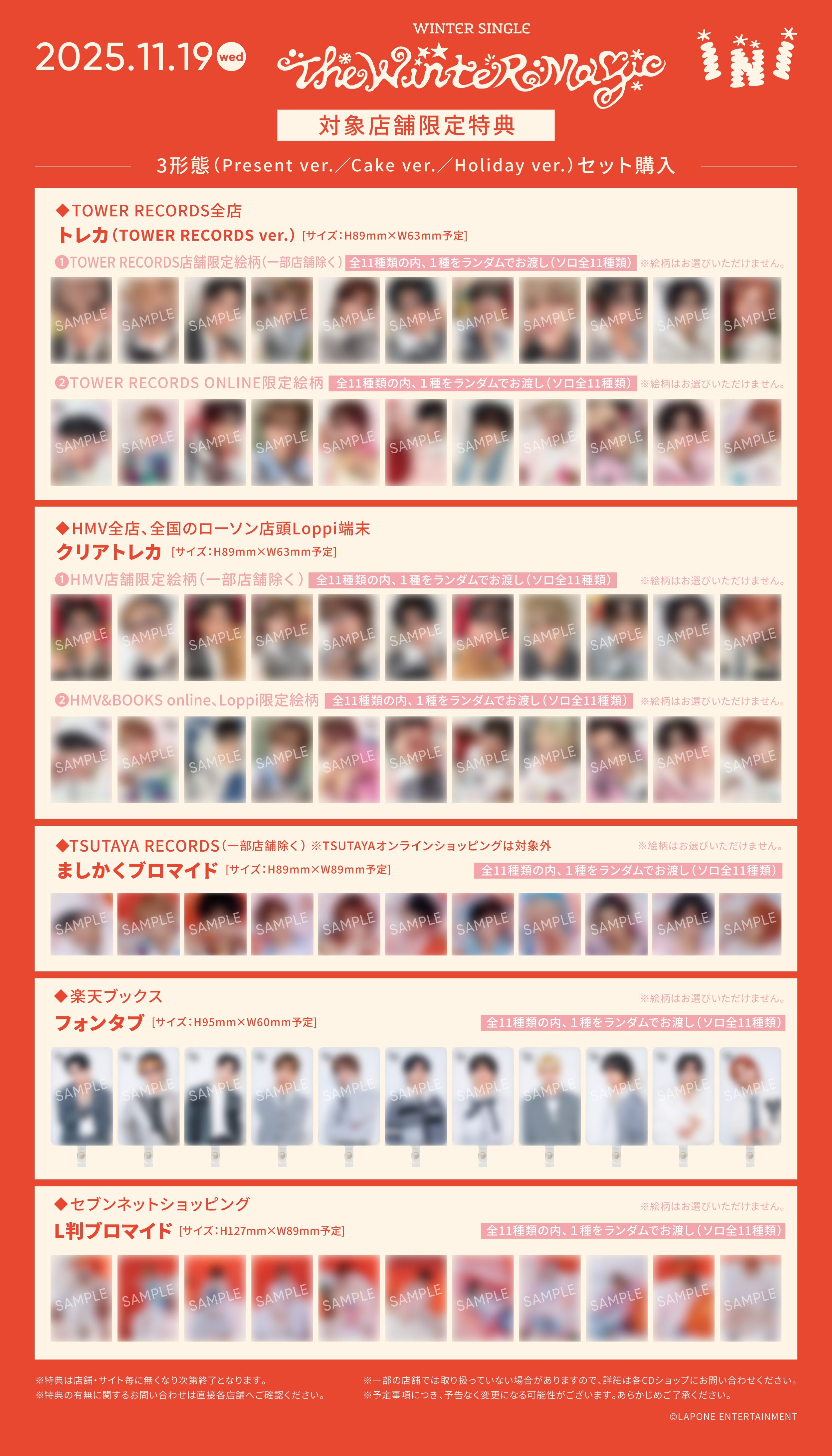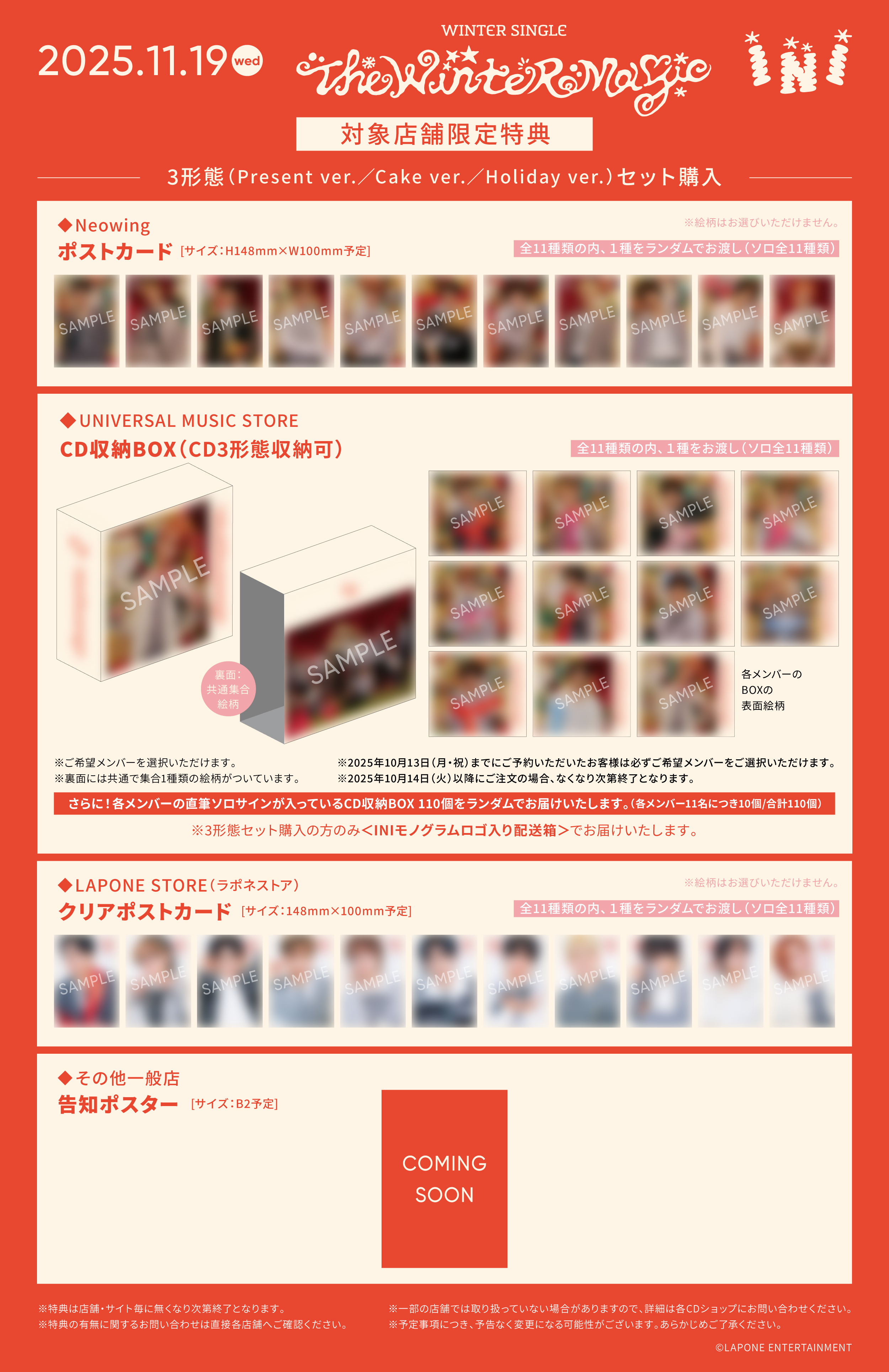 2025年11月19日(水)発売のINI WINTER SINGLE『THE WINTER MAGIC』(Present ver./Cake ver./Holiday ver./Sweet ver.)を対象店舗にてご予約(ご購入)いただくと、下記の先着特典をプレゼントいたします。いずれの特典もなくなり次第終了となりますので、お早めにご予約ください。