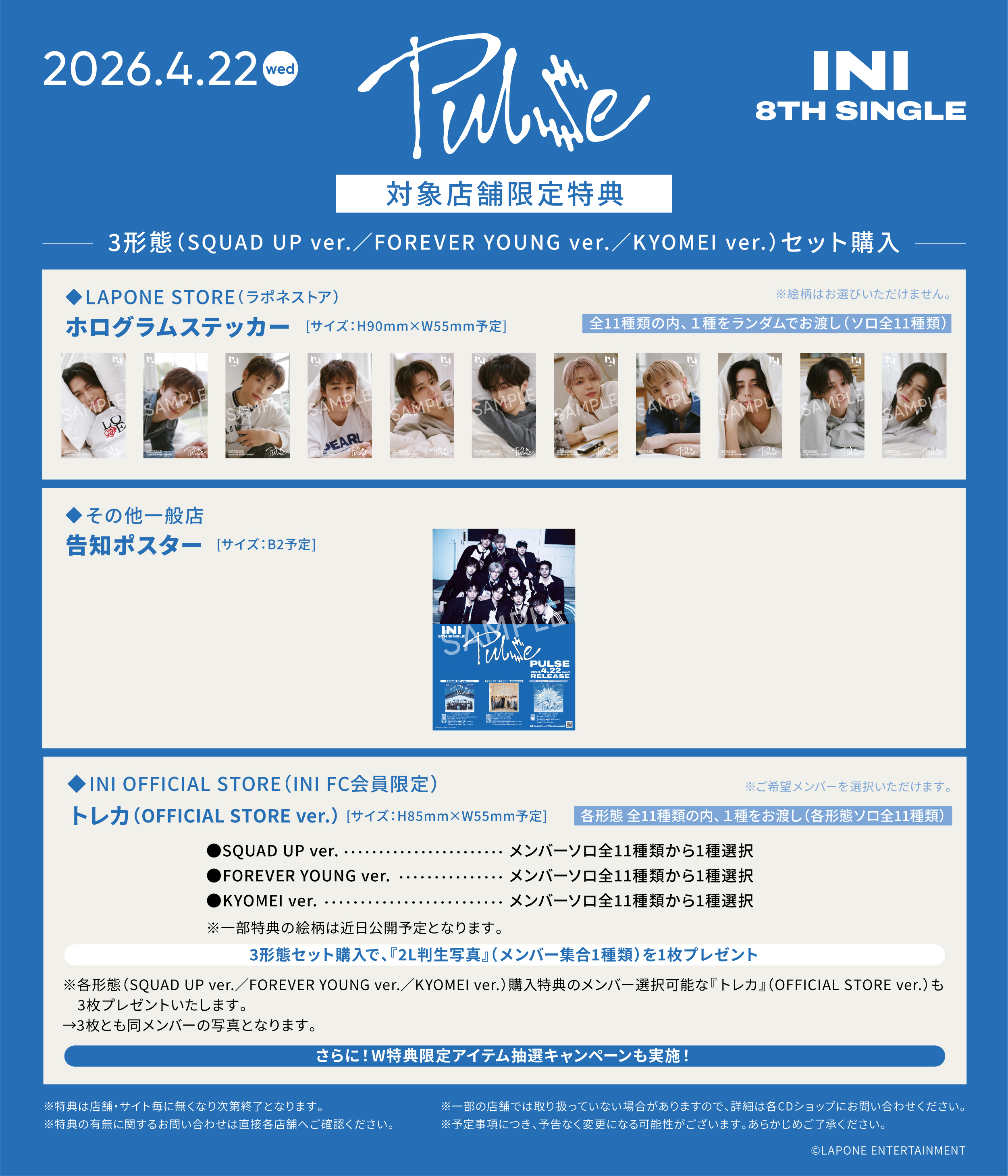 2026年4月22日(水)発売の8TH SINGLE『PULSE』(SQUAD UP ver./FOREVER YOUNG ver./KYOMEI ver.)を対象店舗にてご予約(ご購入)いただくと、下記の先着特典をプレゼントいたします。いずれの特典もなくなり次第終了となりますので、お早めにご予約ください。